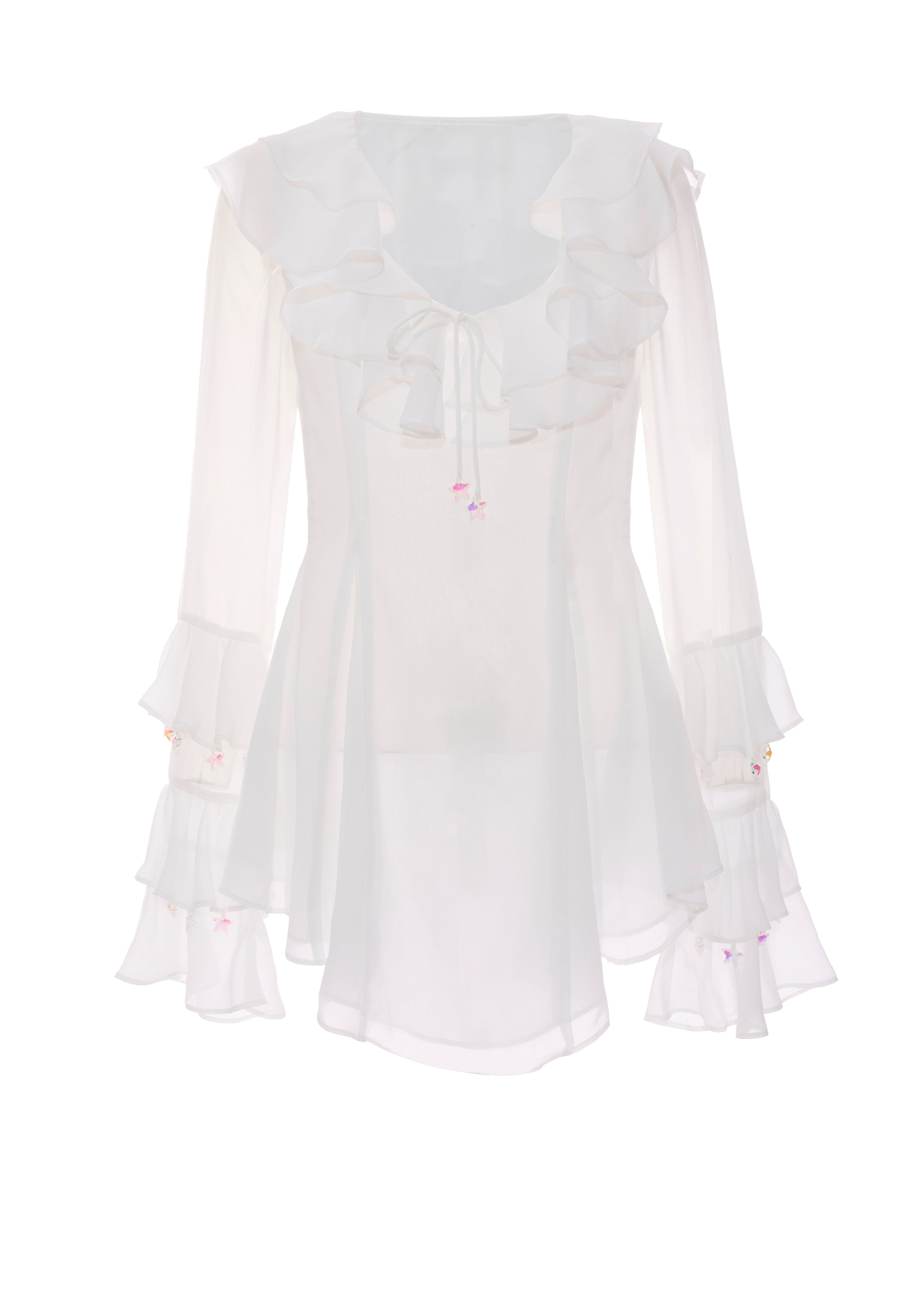 The Stella Dress is a sheer, flowy Sparkl signature piece designed to make you the star of your life. Crafted in weightless, ethereal fabric that moves like light itself, it features romantic ruffled long sleeves and a softly draped neckline with delicate tie detailing for an adjustable, elegant finish. Star pendants shimmer at the ends of each sleeve, catching every flicker of light like a constellation in motion. With its dreamy silhouette and celestial detailing, the Stella Dress embodies Sparkl’s world of elevated femininity—bold, radiant, and unforgettable. Made for nights that glow brighter than the rest, this is the moment you don’t just enter… you shine.