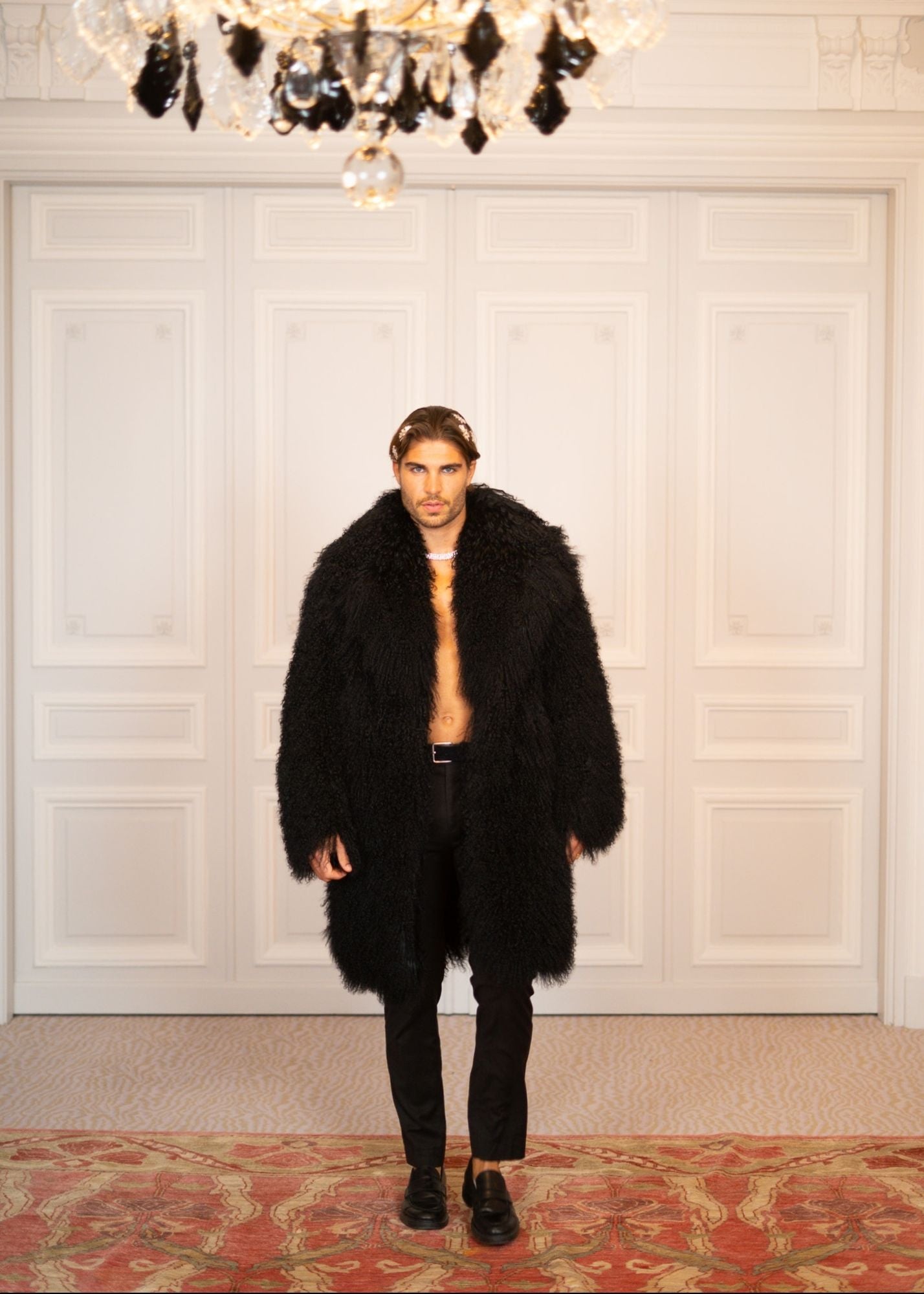 Command the night in the Noir Full Length Coat. A striking blend of vintage glam and modern fairy edge. Wrapped in plush, cloud-soft Mongolian shearling in a deep, inky black, this coat delivers pure drama and endless sparkl.